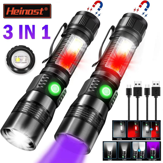 3In1 LED Flashlight with COB Sidelight Rechargeable Magnetic Torch Zoom Waterproof Ultraviolet Light Flashlight for Pets Camping